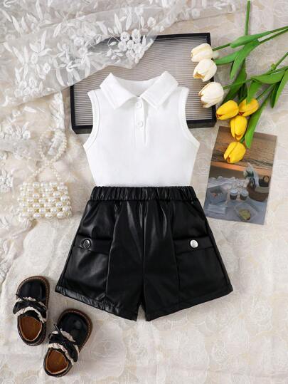 两件套,女婴春夏街头风,无袖半开领上衣和皮短裤 - 卡其色 - 查看 1