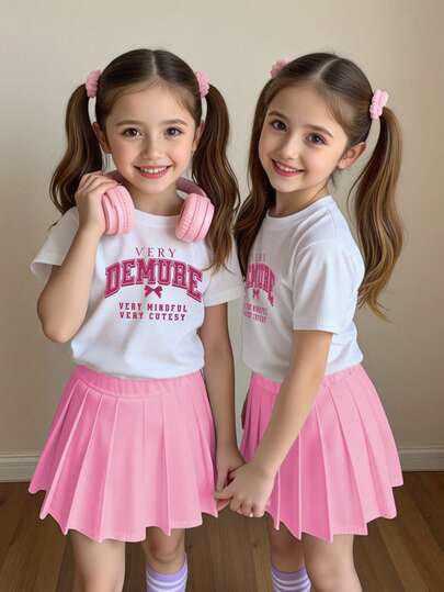 两件套休闲时尚夏季标语印花短袖上衣和迷你裙,白色T恤和粉色百褶裙 - 彩色 - 查看 1