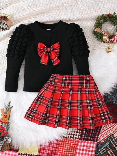 2 件套可爱蝴蝶结泡泡袖针织圆领上衣和圣诞格子裙套装,长袖,适合春秋季 - 黑色 - 查看 1