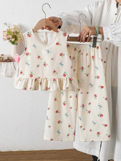 2件套女童夏季无袖V领荷叶边上衣和碎花裤休闲套装 - 杏色 - 查看 1