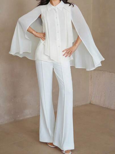 DAZY 2 件套女式纯色单排扣斗篷衬衫和长裤,荷叶边 - 白色 - 查看 1