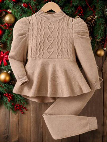 2 件套年轻女孩和幼儿女孩纹理腰部毛衣和针织打底裤,女孩秋季休闲保暖服装 - 杏色 - 查看 1