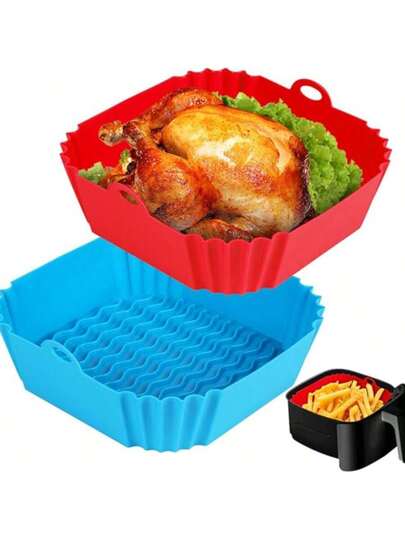 2pcs Square Silicone Air Fryer Liners - 8 Inch Reusable Air Fryer Pan - Air Fryer Accessories - 4 To 7QT Oven Microwave Accessories (Red + Blue)