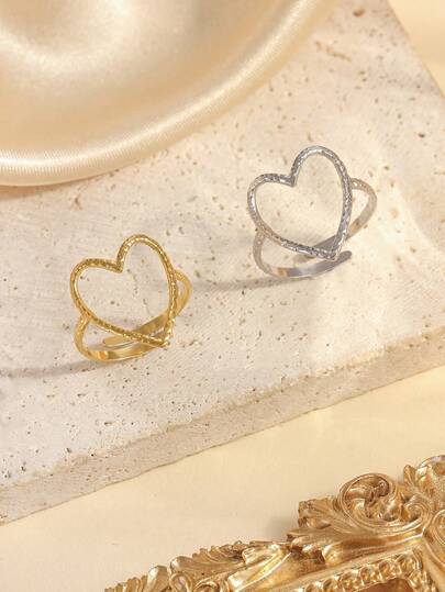两件套不锈钢简约金银心形开口戒指,适合女士日常佩戴或作为礼物 - 彩色 - 查看 1