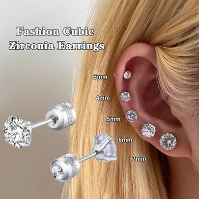 2只装不锈钢锆石耳钉,女士款,3/4/5/6/7毫米立方氧化锆耳钉,派对婚礼礼物 - 四爪鋯石耳環_一對 - 查看 14
