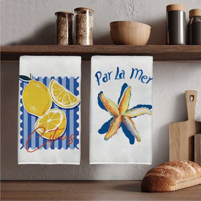 2条装条纹夏季柠檬海星图案超细纤维厨房毛巾,乔迁新居和家庭聚会的完美礼物,厨房抹布,节日家居装饰