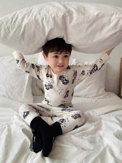 DAZY 2 件套幼儿男童卡通熊猫印花圆领上衣和裤子舒适睡衣套装 - 杏色 - 查看 2
