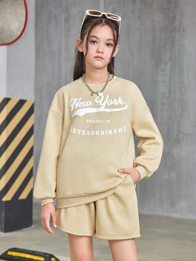 2 件 Tween 女童超大奶茶色全印花运动衫和宽松短裤套装 - 卡其色 - 查看 1