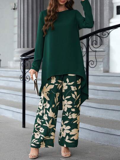EMERY ROSE 女款純色簡約上衣+印花褲子兩件套 - 綠色 - 查看 1