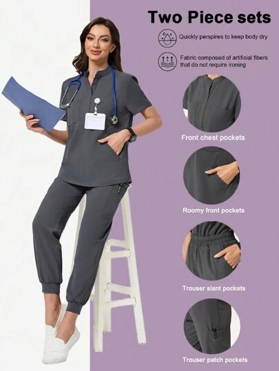 Scrubzie 2 件套女式手术服套装:抗皱立领上衣,带多个口袋和松紧腰裤 - 灰色 - 查看 1