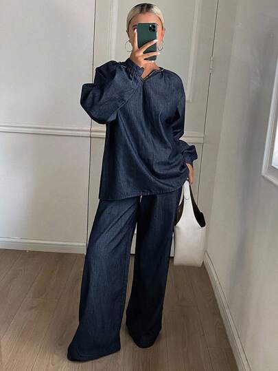 2 件女式水钻装饰 V 领长袖上衣和宽松长裤休闲牛仔套装,度假风格