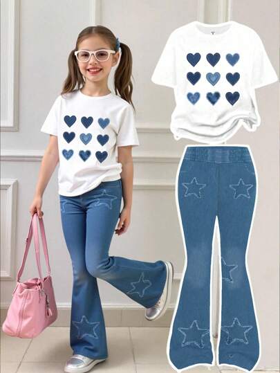 2 件年轻女孩休闲时尚可爱牛仔印花心形图案短袖圆领 T 恤和喇叭裤套装,适合夏季日常外出 - 彩色 - 查看 1