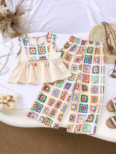两件套女童流苏背心上衣和印花阔腿裤套装,轻薄夏季服装 - 彩色 - 查看 1