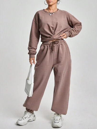 EURMUSE 2 件/套女式純色上衣和褲子套裝 - 卡其色 - 查看 1