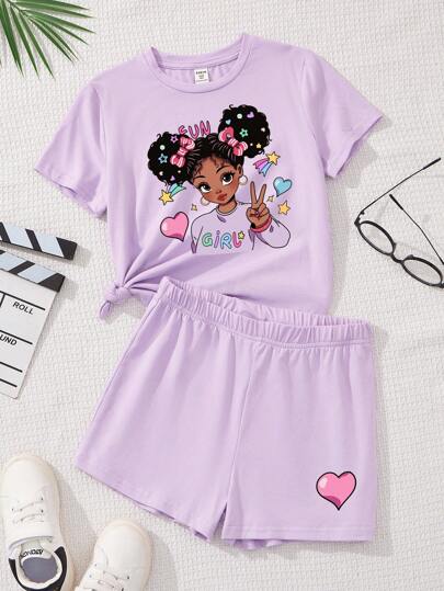 SHEIN Leap Crew 女童休闲简约图案短袖上衣和短裤套装(2件套),适合夏季,棉混纺 - 淡紫色 - 查看 1