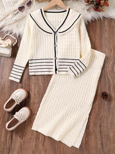 SHEIN 2 件套女童秋季服装,时尚简约粗针织开衫和迷你裙,适合青少年女孩 - 白色 - 查看 1