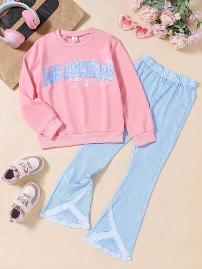 2 件套女童时尚罗纹圆领字母印花粉色运动衫和牛仔效果长裤套装 - 彩色 - 查看 2