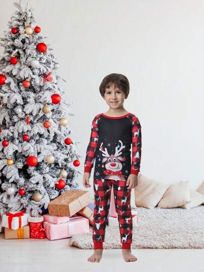 2 件套幼儿男孩紧身圣诞家庭睡衣套装,长袖格子驯鹿印花睡衣家居服套装 - 黑色 - 查看 1