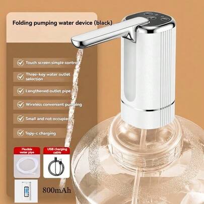 三键电动饮水机,C型充电,适用于3-5加仑大口径瓶装水,一键出水,可折叠紧凑设计,方便携带和存放,适用于家庭、餐厅、厨房、办公室、露营等场所。