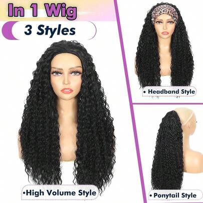 三合一合成假发,长款水波纹黑色假发,无缝翻转式免胶新手友好型深波浪卷发假发,配有抽绳头带,适合日常佩戴 - 彩色 - 查看 1
