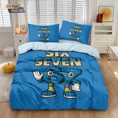 三件套“六七”主题蓝色时尚流行数字6、7图案床上用品套装,包含1个被套和2个枕套(不含枕芯),高清染色,100%涤纶面料,舒适柔软,拉链封口,可机洗,适用于家庭卧室、客房、旅行露营和宿舍。 - 6770+SJT+C - 查看 1