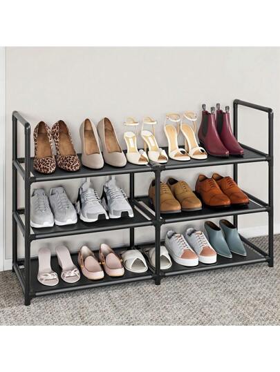 3層鞋架,可容納12-15雙鞋,堅固可堆疊鞋架,可擴展調節布質鞋子收納盒,耐用的金屬鞋子存儲組織者 - 黑色 - 查看 1