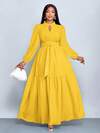 SOLERSUN 大码女装纯色宽松休闲立领前开衩水滴扣高端设计长袖腰带修身A字长裙,优雅舒适休闲时尚通勤气质连衣裙,新款,日常穿着,新年、秋季、冬季、约会、圣诞节,女装