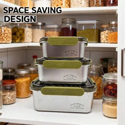 304不锈钢食品储物盒,配透明塑料盖,密封冰箱收纳盒,适用于存放水果、腌菜、大米等。 - 大號三件組[1000+1600+2800]綠扣 - 查看 10