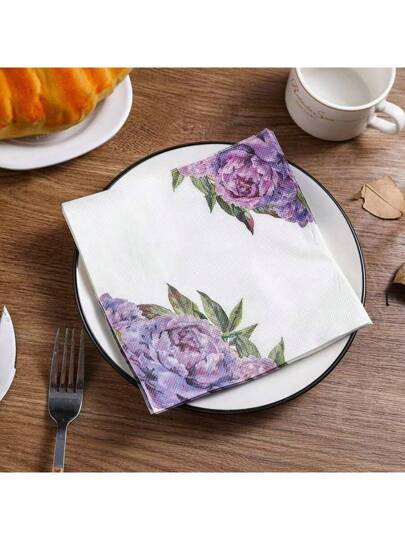 30 件花卉印花一次性餐巾 - 适合派对、聚会和餐桌装饰,白色底色搭配紫玫瑰和绿叶图案 - 彩色 - 查看 5
