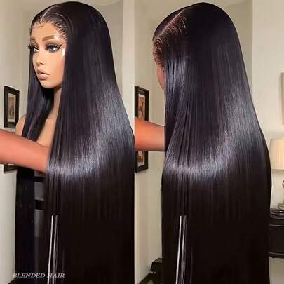 32英寸直发蕾丝前假发,升级版13x4高清透明蕾丝前假发,自然发际线,巴西原生发蕾丝前假发,5x5免胶佩戴,200%密度,1B黑色,预先拔毛,带婴儿发,混合假发 - 自然色&黑色系 - 查看 1