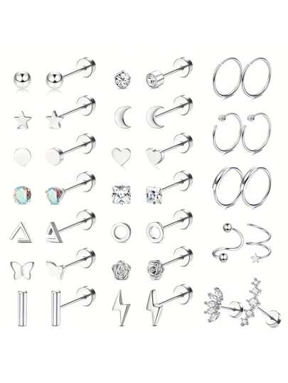 38件医用级不锈钢平底耳环,男女通用,包含18G不锈钢耳钉和耳环,以及小巧的锆石心形、星星、月亮和蛋白石耳骨耳环。 - 如圖所示 - 查看 1