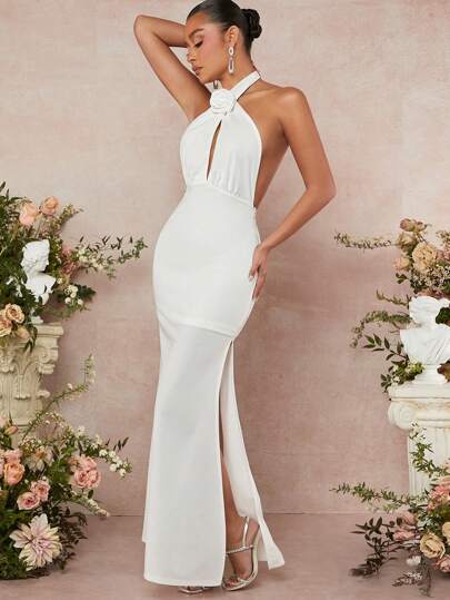SHEIN Unity 3D 玫瑰花结交叉挂脖开衩连衣裙 - 白色 - 查看 1