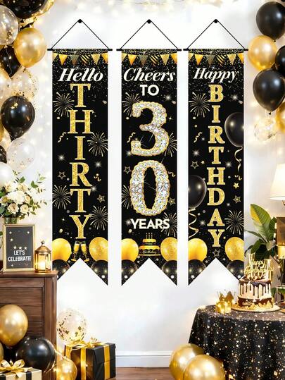 3件套30岁生日黑金门牌,闪亮30岁生日快乐门柱对联,125*30厘米涤纶悬挂横幅,30岁生日派对装饰,生日悬挂旗帜,生日庆祝用品,生日派对背景装饰,生日家居装饰,庭院装饰