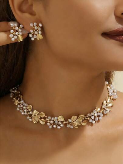 3件套波西米亚风仿珍珠首饰套装 - 复古树叶设计项链和耳环,锌合金材质,休闲装扮或派对场合的完美之选 - 套裝 - 查看 3