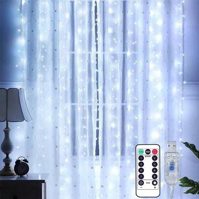 3米 x 3米窗帘灯串,300颗LED灯珠,8种模式,遥控悬挂式灯串,适用于卧室、婚礼、派对(冷白光) - USB 窗簾燈 - 查看 1
