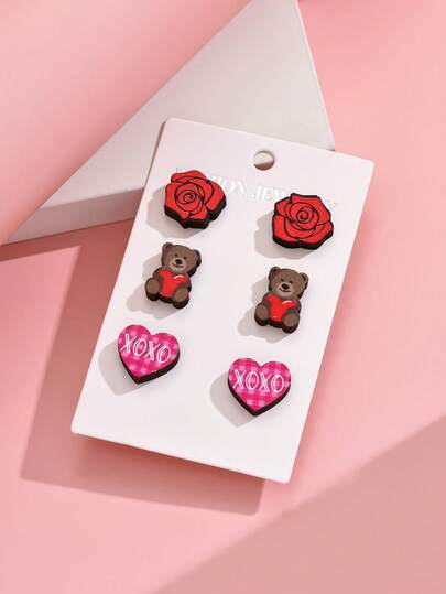 3對/組時尚女士耳環套裝,有心形、玫瑰、唇形、熊、信封等設計,非常適合約會和情人節禮物 - 彩色 - 查看 3