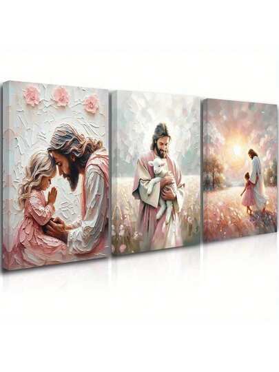 3 件耶稣和小祈祷墙饰、粉色耶稣和墙饰耶稣艺术印刷品、耶稣和小女孩行走艺术品海报墙、耶稣帆布画儿童房、家居装饰、宗教、墙艺、海报、- 帆布材料(可选框架) - 多色 - 查看 1