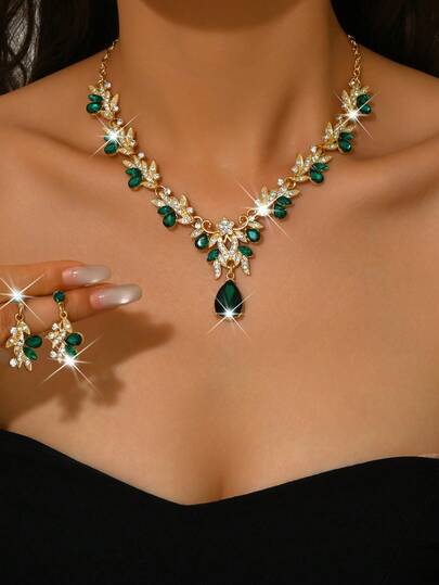 3 件套奢华婚礼派对女士礼服水钻装饰珠宝时尚闪亮颈链项链和耳环套装舞会服装珠宝套装配饰(2 个耳环和 1 条项链) - 水鑽珠寶套裝 - 查看 1