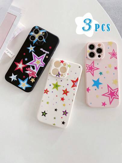 3入組黑、白、粉色柔軟矽膠手機殼,具有不同的星星圖案,全身保護套並帶有相機鏡頭,適用於iPhone - 彩色 - 查看 3
