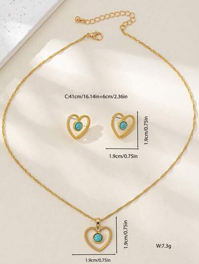 3 件套新娘绿松石心形油滴吊坠项链和耳环奢华珠宝套装 - 金色 - 查看 1