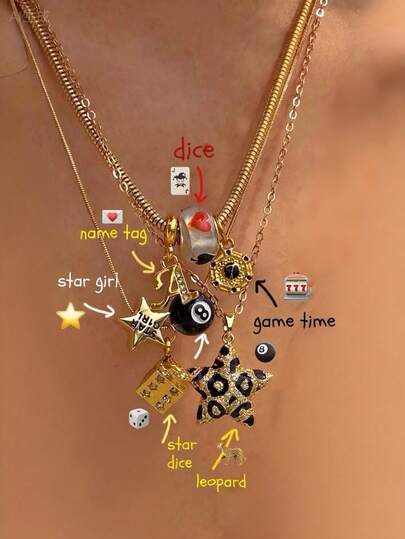 3件套豹纹星星项链、Y2K星空女孩项链、扑克牌星星骰子项链套装、黑色8号球项链、英文字母纪念项链 - 金色 - 查看 3