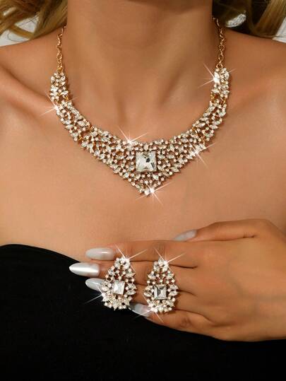 这款闪亮水晶女士首饰套装包含3件,红色项链和耳环,设计简约优雅,是婚礼、派对和各种场合的完美配饰。