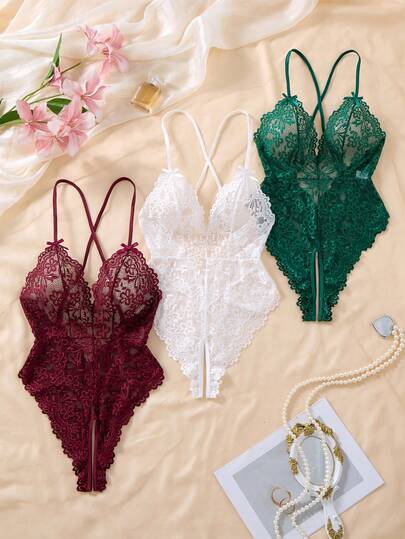 6. 3件套女士花卉蕾丝透视网纱交叉露背连体衣套装