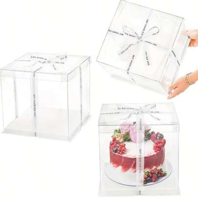 3个装高款透明蛋糕盒,带丝带 - PET材质透明方形蛋糕盒,翻盖式封口,一次性使用,可冷冻,适用于生日、婚礼、甜点展示 - 白色 - 查看 1