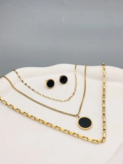 3入組時尚女士18K金鍍黑色圓形多層項鍊和耳環套裝,是生日、母親節、情人節、約會、舞會、婚禮季節和波西米亞度假風格的理想禮物 - 彩色 - 查看 3