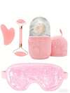 四件套面部护理套装,包含心形刮痧板、二合一双头按摩滚轮、冷热凝胶眼膜和可重复使用的硅胶冰格——家用SPA面部护理套装,紧致肌肤按摩器套装,馈赠亲友,男女通用