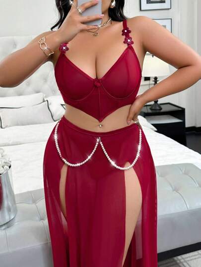 3 件套网状性感仿珍珠花朵装饰文胸 + 丁字裤 + 开衩腰裙 - 酒紅色 - 查看 1