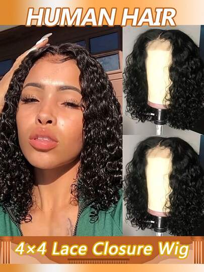 4*4蕾丝闭合假发,蓬松卷曲波波头蕾丝前额假发,预先拔毛,带婴儿发,透明蕾丝假发,适合女性日常佩戴,200%密度 - Natural Black - 查看 4
