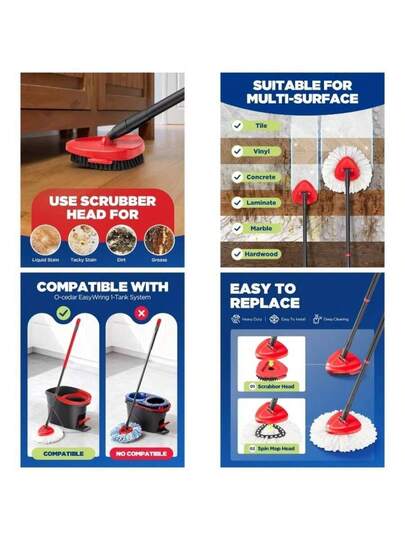 4 - In - 1 Mop Heads Replacements O Cedar EasyWring 1 System, Includes 1 Base 1 Scrub Brush 2 Spin Mop Heads, Full Set Mop Replace Heads Cleaning Home, Bathroom Kitchen
