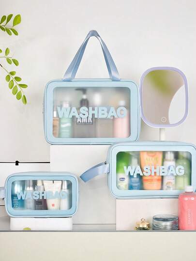 四合一夏季旅行化妆包,PVC 防水洗漱用品收纳袋,化妆包,沙滩袋,适用于眼影、卫生巾、口红、化妆品、眼线笔、唇彩、护肤品,夏季旅行必备,适合购物、度假、居家、浴室、假日、海滩 - 藍色 - 查看 19